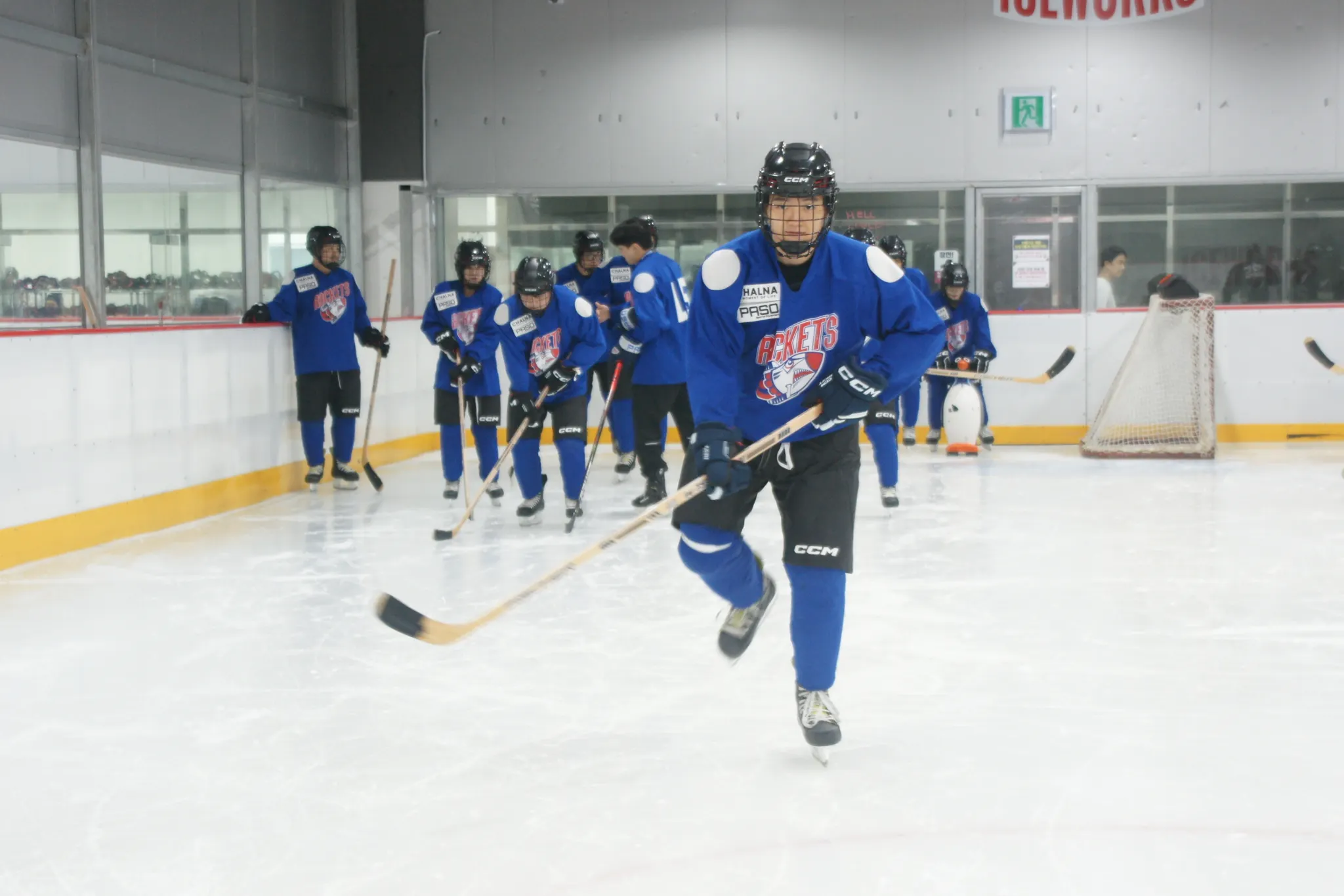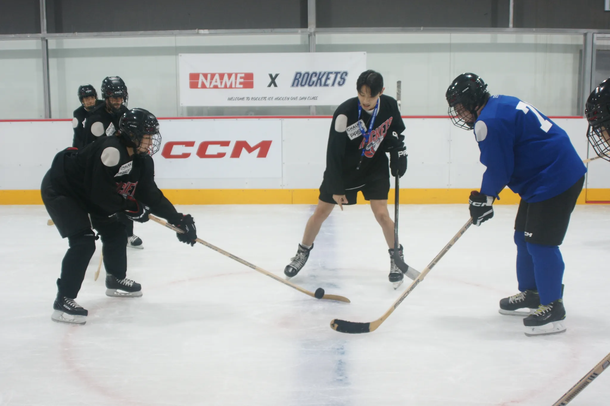 아이스하키 공(퍽) 드리블하며 스케이트 타기
