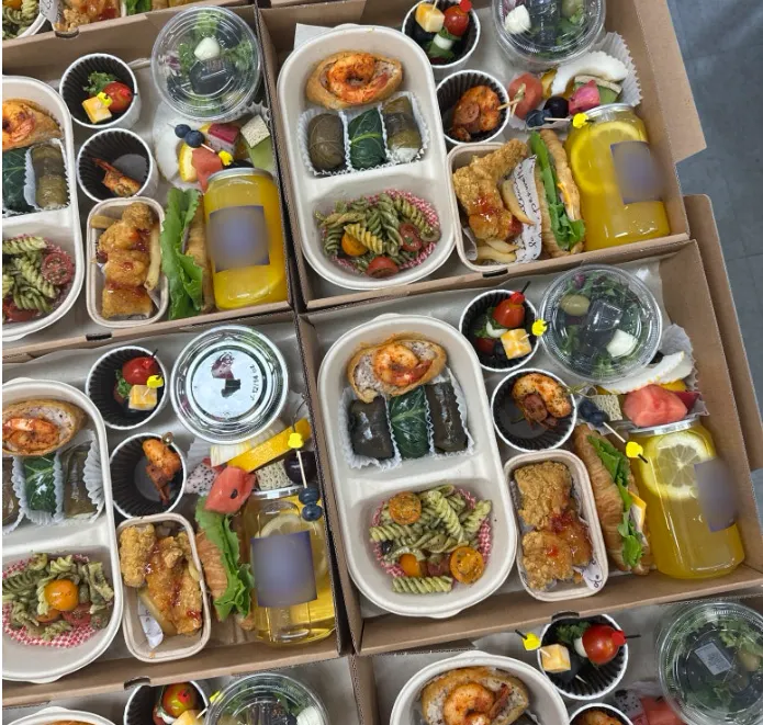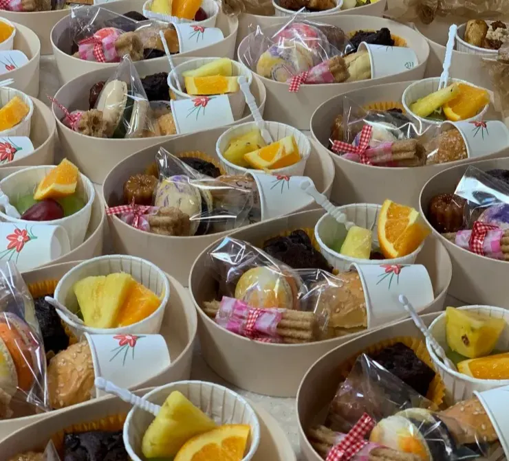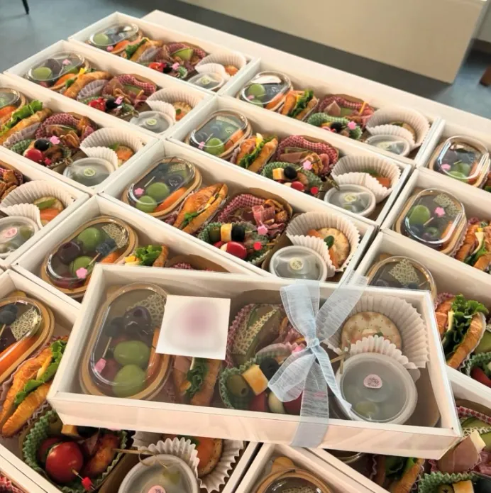 예시 구성 3 : 쌈밥 5종 (유부, 케일, 명이, 깻잎, 새우) , 바질페스토파스타, 카아햄치즈크로와상샌드위치, 발사믹샐러드, 제철과일, 앙버터모나카, 래드밸뱃도지마를, 호두타르트, 에그타르트, 까눌레 또는 마카롱
