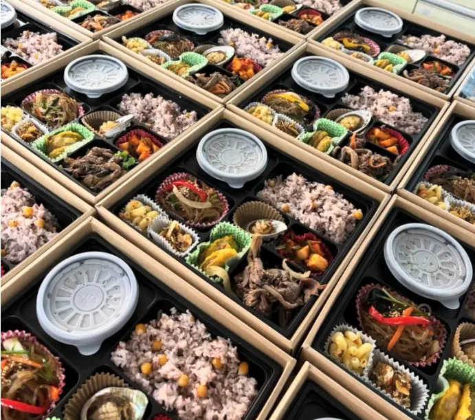 예시 구성 : 오곡밥, 고추장 돼지불고기, 아몬드 멸치 볶음, 김치, 마카로니 샐러드, 오리훈제 샐러드, 과일