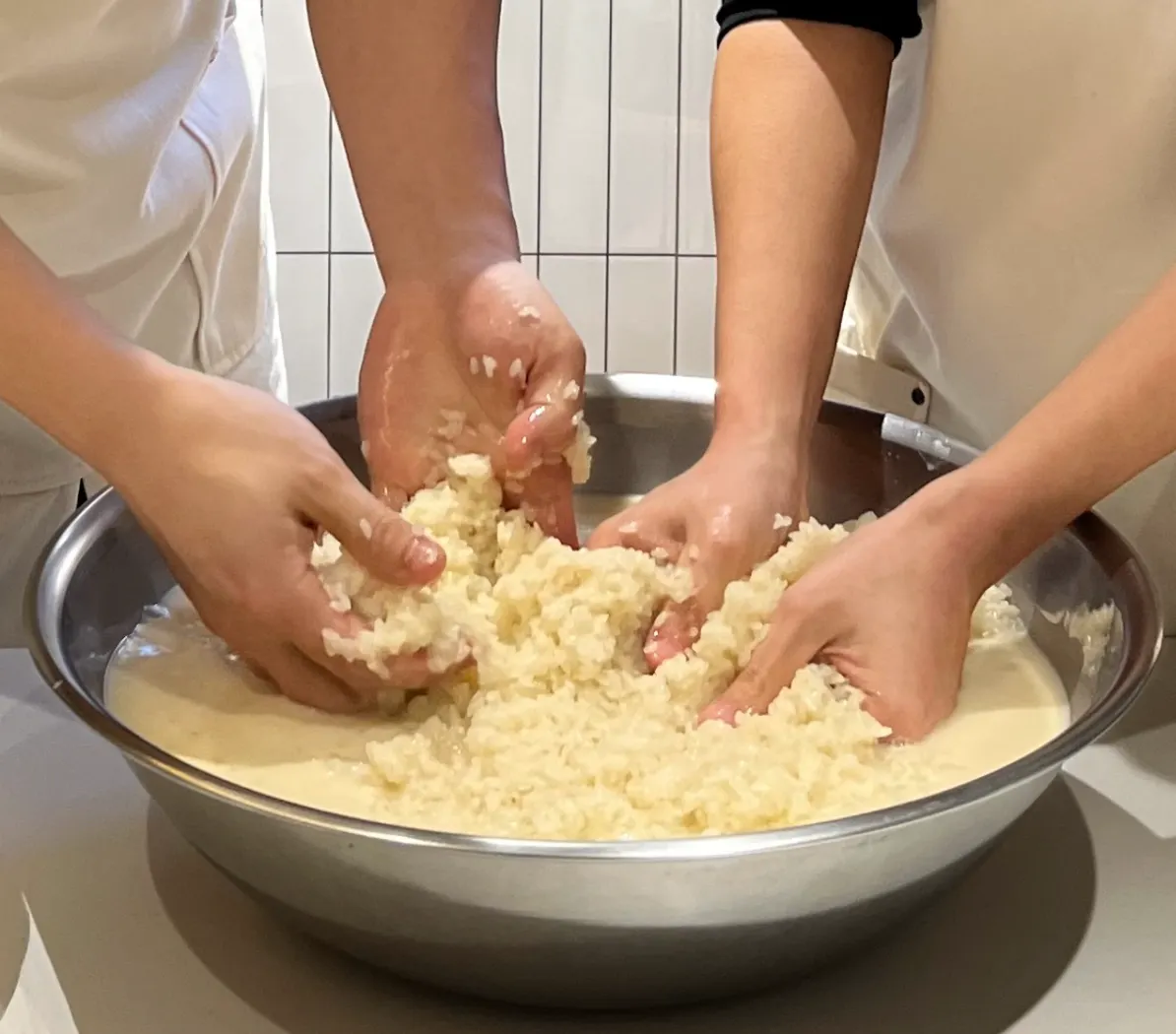 덧술 (2단 담금) 고두밥 투입 후, 술빚기(치대기) 작업