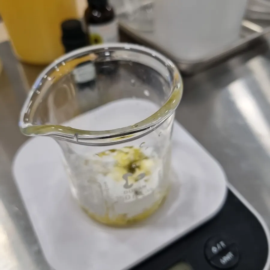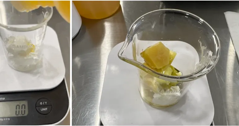 : 비커에 시어버터, 천연비즈왁스, 피마자오일, 호호바오일, 아보카도오일을 다 넣고, 무게를 측정합니다.