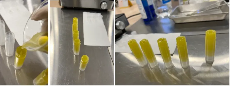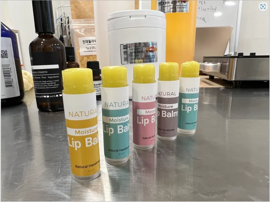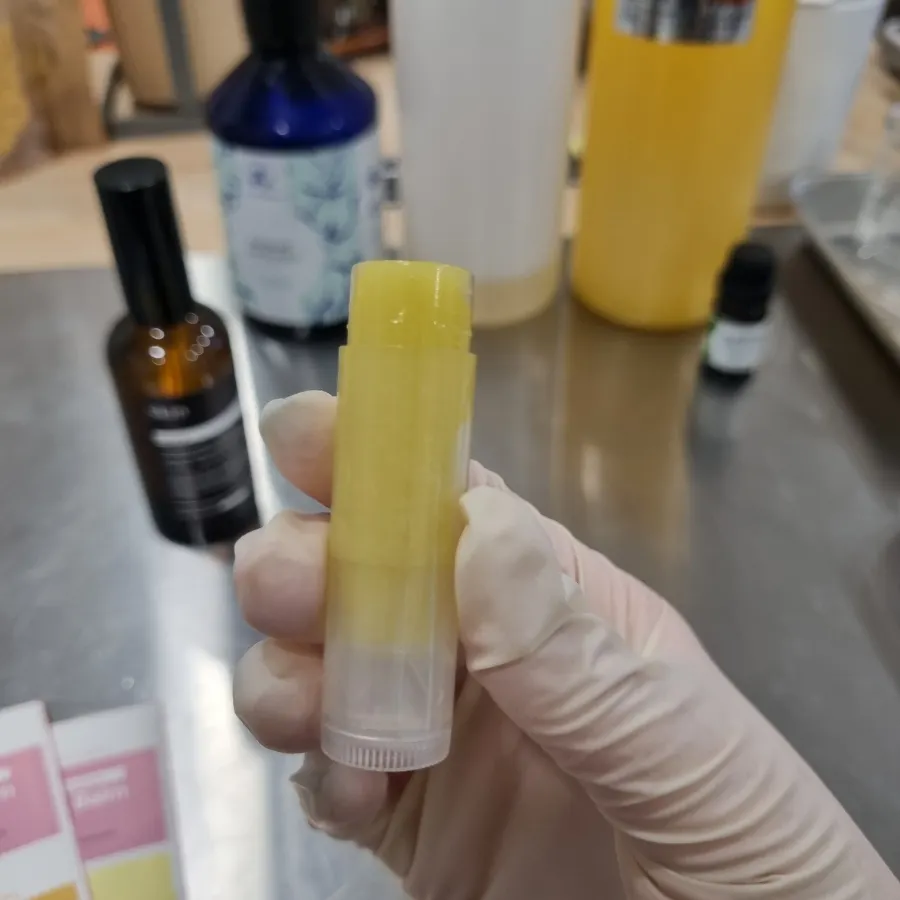 : 잘 섞은 녹인 립밤재료를 굳기 전에 재빠르게 소독한 립케이스에 넣어줍니다. 그 후, 스티커를 붙여주면 완성! 천연왁스 그대로의 노란색이라 더욱 더 천연스럽습니다.