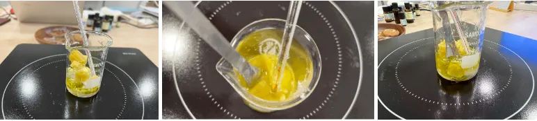 : 인덕션에서 가열하면서 골고루 섞어줍니다. 식물성오일과 천연왁스의 특성상 너무 고온에서 가열할 경우 그 효과가 많이 떨어집니다! 최대 60도를 넘기지 않도록 주의하면서 왁스가 다 녹을 때까지 계속해줍니다.