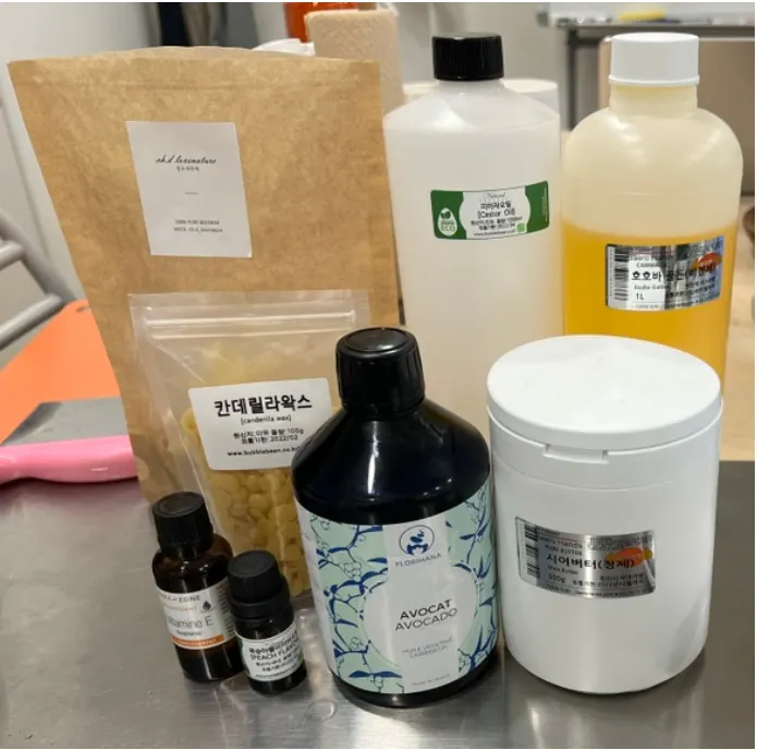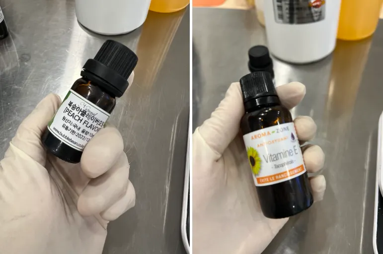 : 내용물 중 왁스가 다 녹으면, 향을 내기 위해 복숭아플레이버오일과 항산화제인 비타민E를 넣어줍니다.