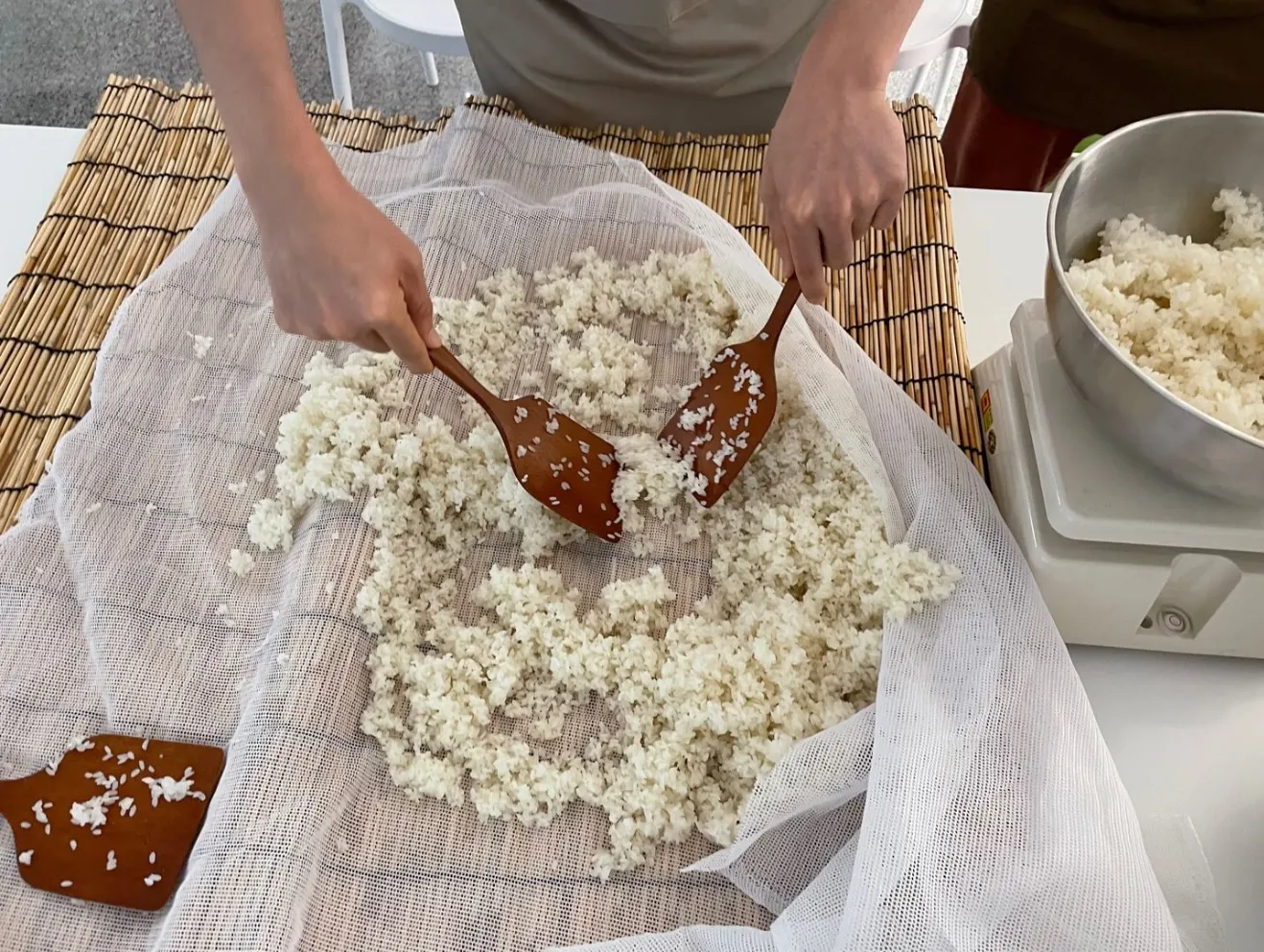 2. 갓 쪄진 고두밥을 뒤집어가며 식혀줍니다.