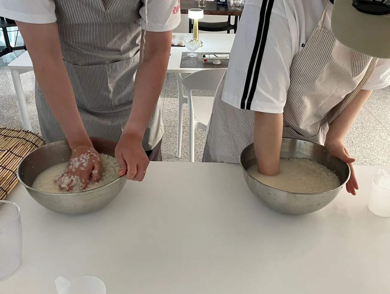 3. 식힌 고두밥을 물, 밑술과 함께 치대줍니다.