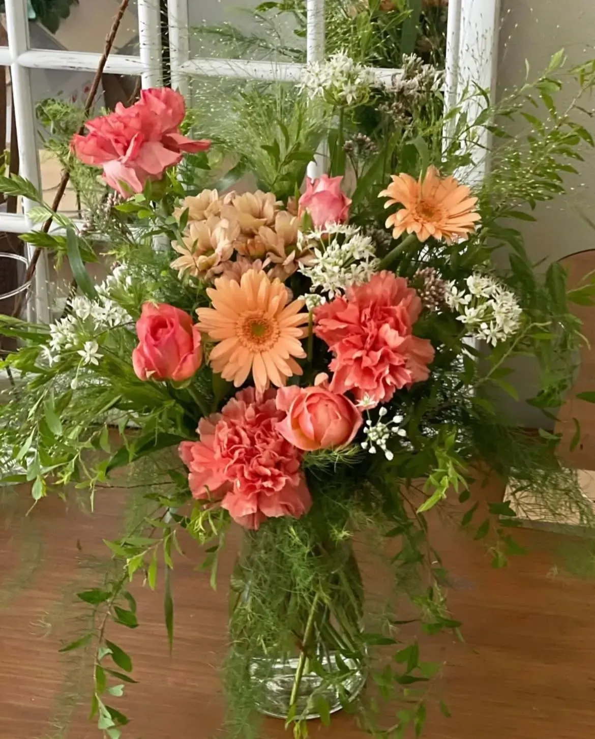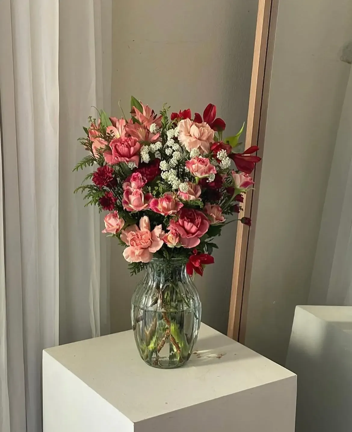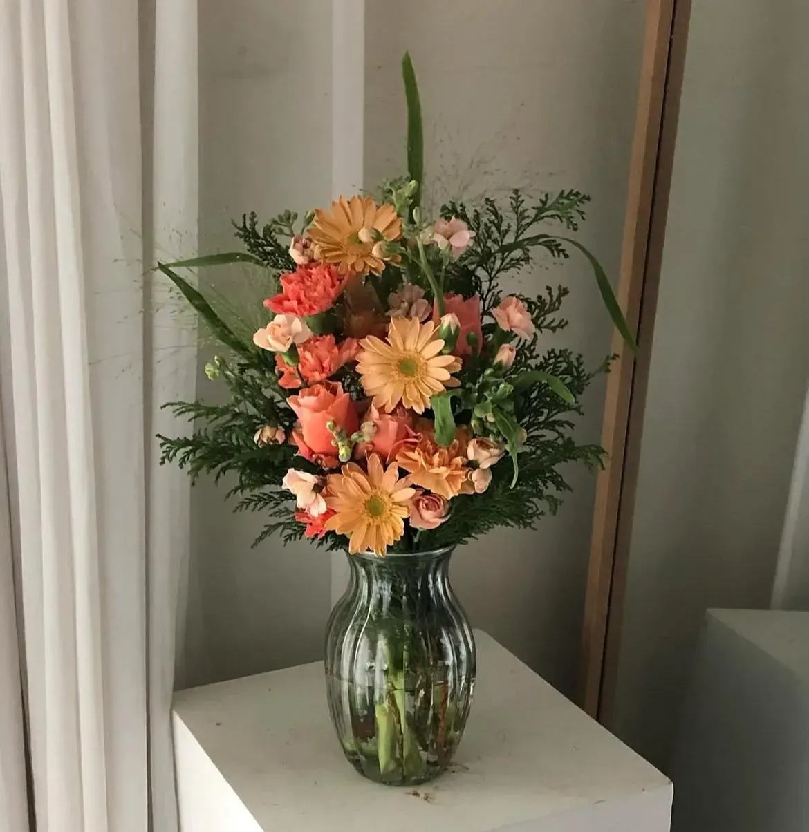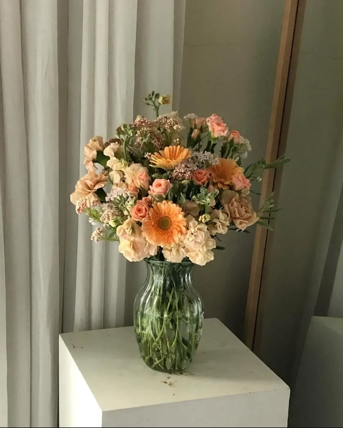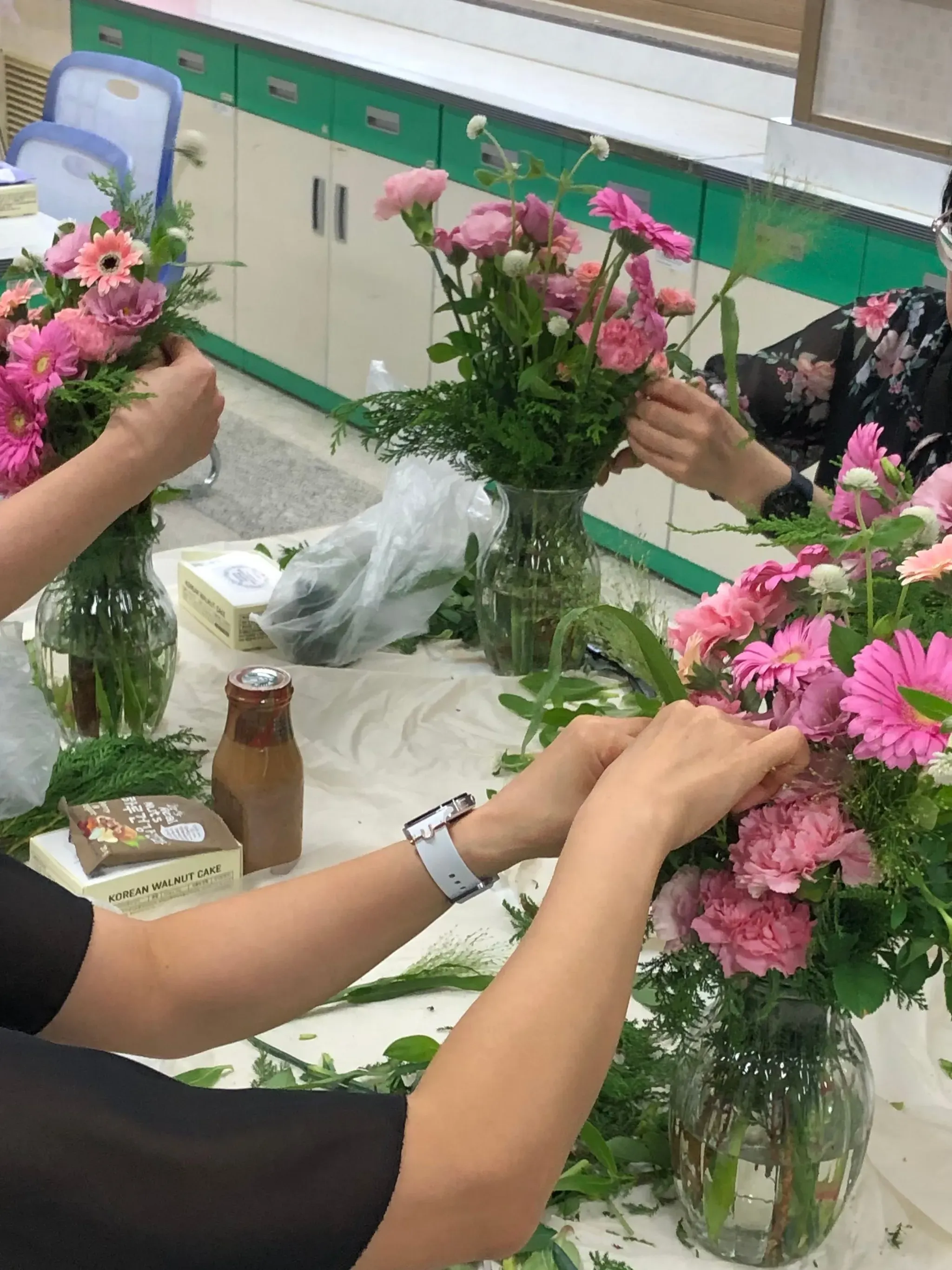 예쁜 화병에 예쁜 꽃들을 가득 담은 느낌으로 꽃꽂이를 합니다.